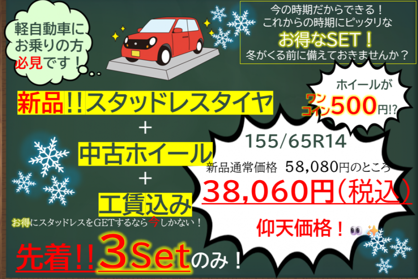 軽自動車のスタッドレスタイヤが安い!工賃コミコミホイール付きで38,060円(税込)