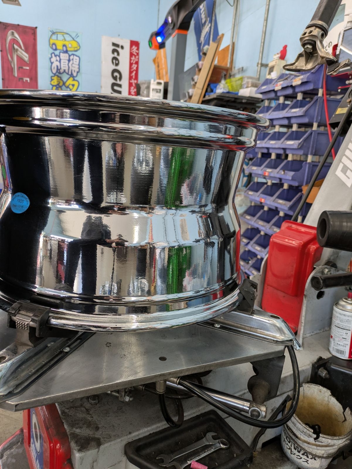そして緊張の空気充填(ビード上げ)。 「パンッ!!」 という乾いた破裂音と共に、タイヤがリムに密着。この瞬間、我々メカニックのアドレナリンも全開になります。