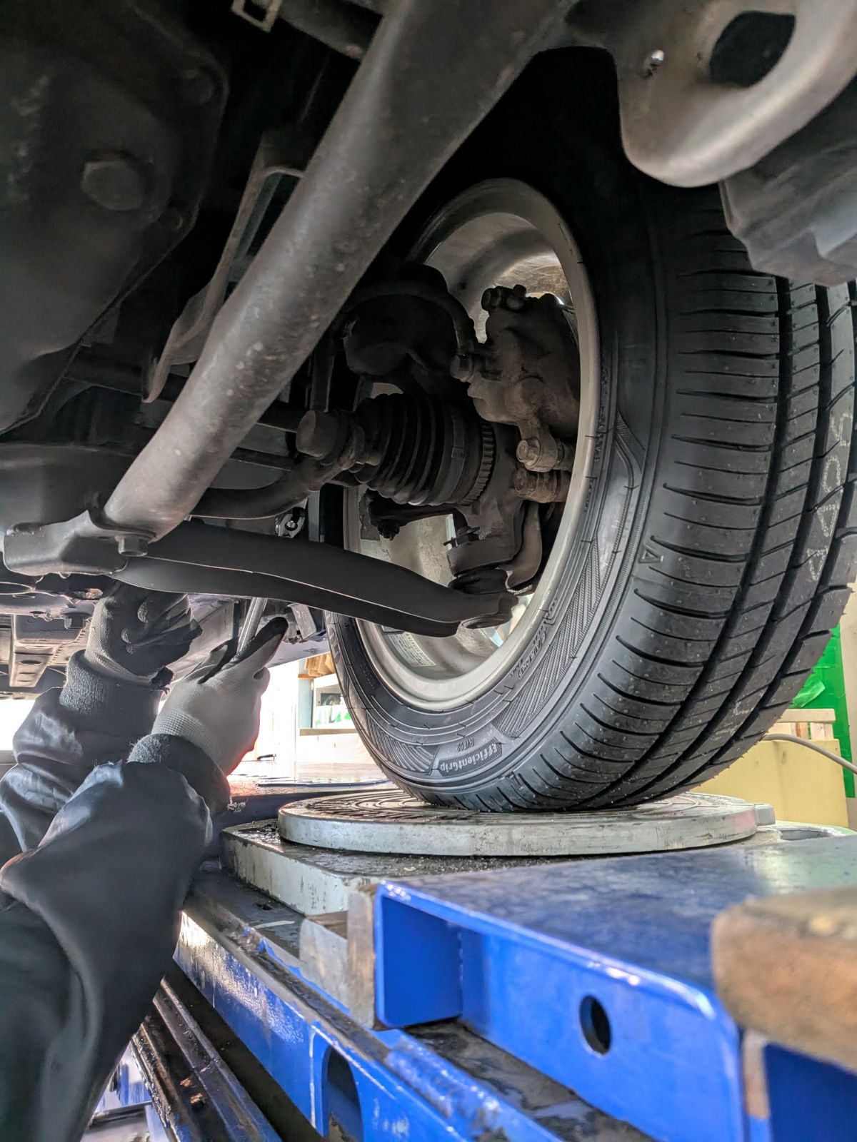 せっかく新品のタイヤに4本とも生まれ変わるなら、最高の状態で乗っていただきたい! ということで、今回も**アライメント(車の骨盤矯正)**を徹底的に行いました。