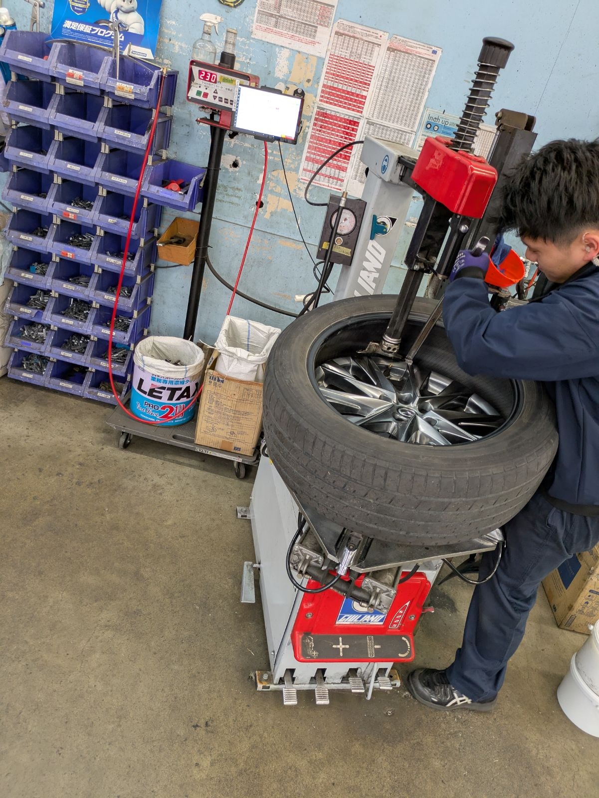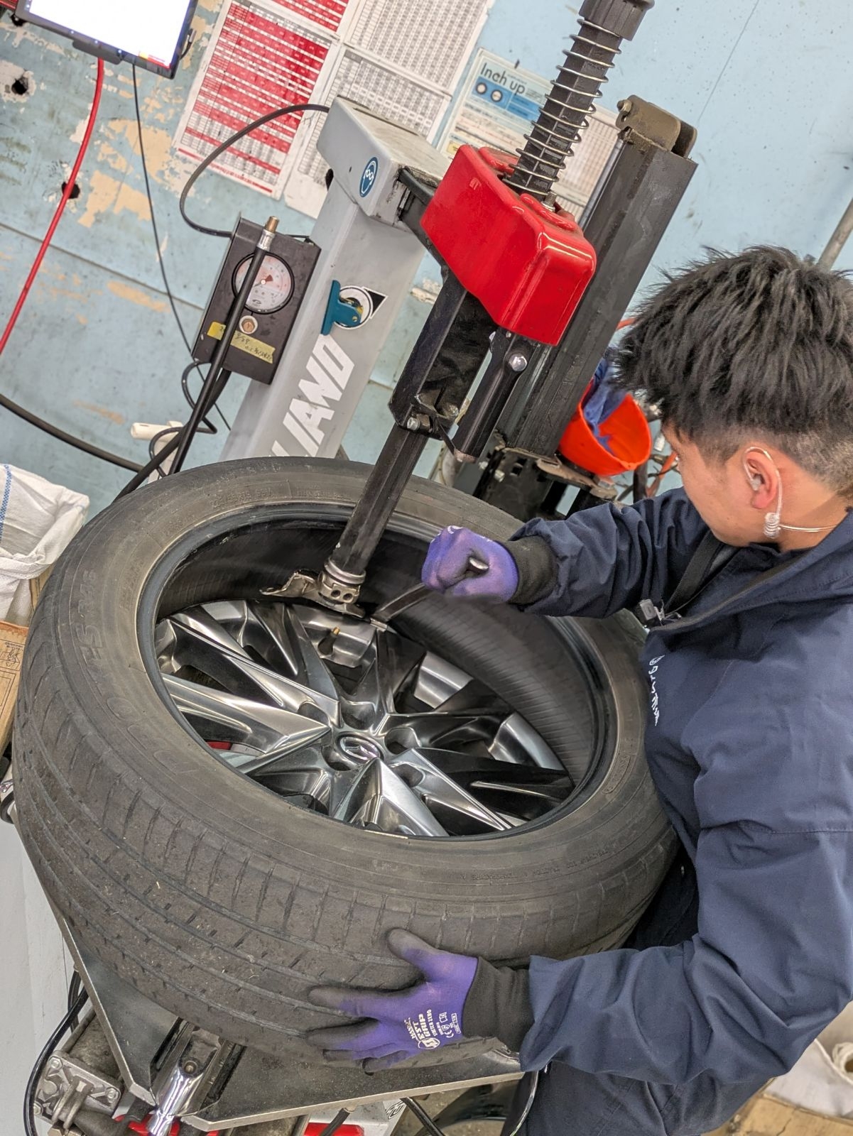 見てください、この真剣な眼差し。 最新のタイヤチェンジャーを駆使し、大切なホイールに傷をつけないよう、慎重かつスピーディーに組み替えていきます。
