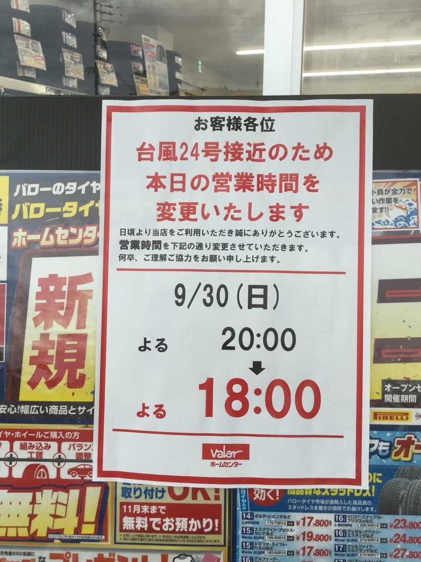台風の影響で18時に閉店となります。