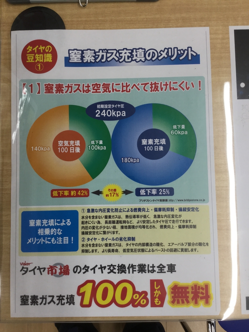 当店では、4本交換の際、通常の空気の代わりに、窒素ガスを入れさせていただいています。窒素ガスは通常の空気よりも分子の大きさが大きく、タイヤから逃げづらいので、適正空気圧が長持ちします!通常、窒素ガスの補充には300円の費用が掛かってしまうのですが、4本交換の際にお配りするメンテナンスカードをお見せ頂ければ無料で補充させていただきます。