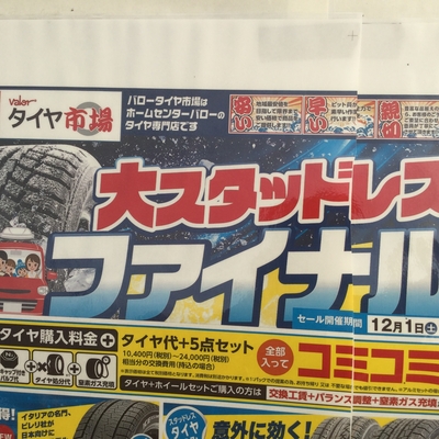とうとう明日から12月です。今年は暖冬という事で、日中は日向にいると汗が出るくらいに暖かいのですが、日の出ていない、朝方や夕方頃は、だいぶ冷え込んでまいりました。皆様、スタッドレスの準備は万端でしょうか?暖冬だからと言って油断していると、いざ雪が降った時に準備不足だった、などといったことが起こるかもしれません。早めの準備(といってももう11月も終わります)は大切です!!
