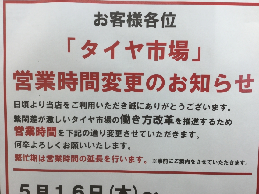 スタッドレスタイヤからサマータイヤへの付け替え交換のピークが終了したことと、近年の働き方改革への企業取組の一環となります。