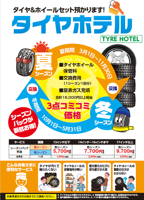 ※東海地方(バロータイヤ市場では)冬期間のお預かりが4月末までとなります。