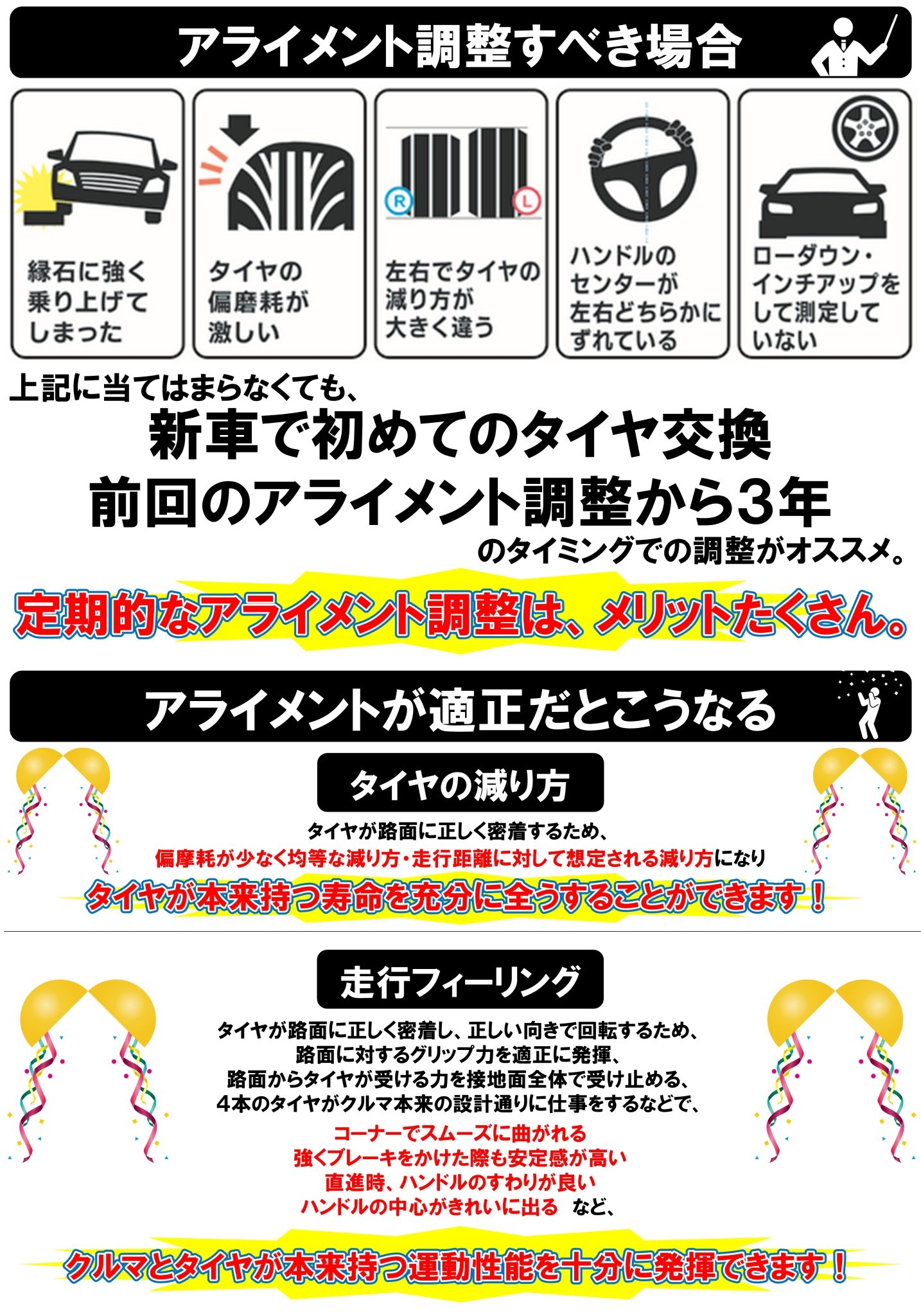 アライメント調整は新品のタイヤに交換されたときにしていただくのが一番ベストです!!