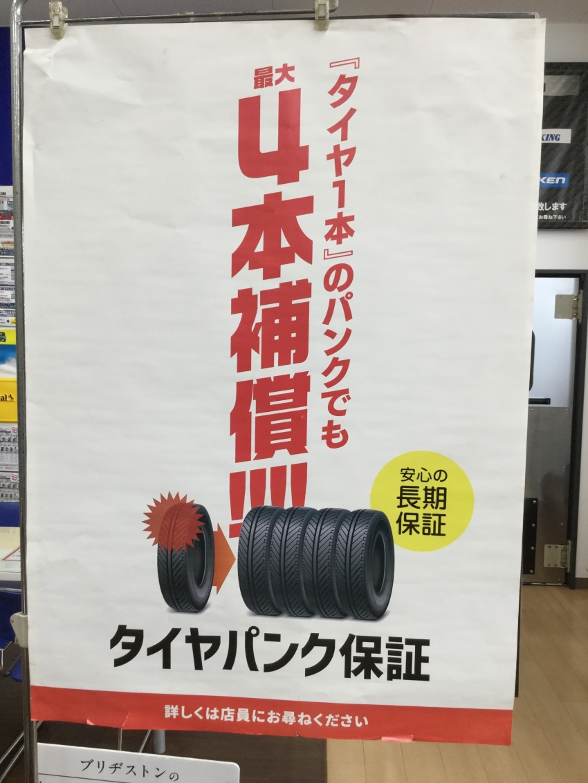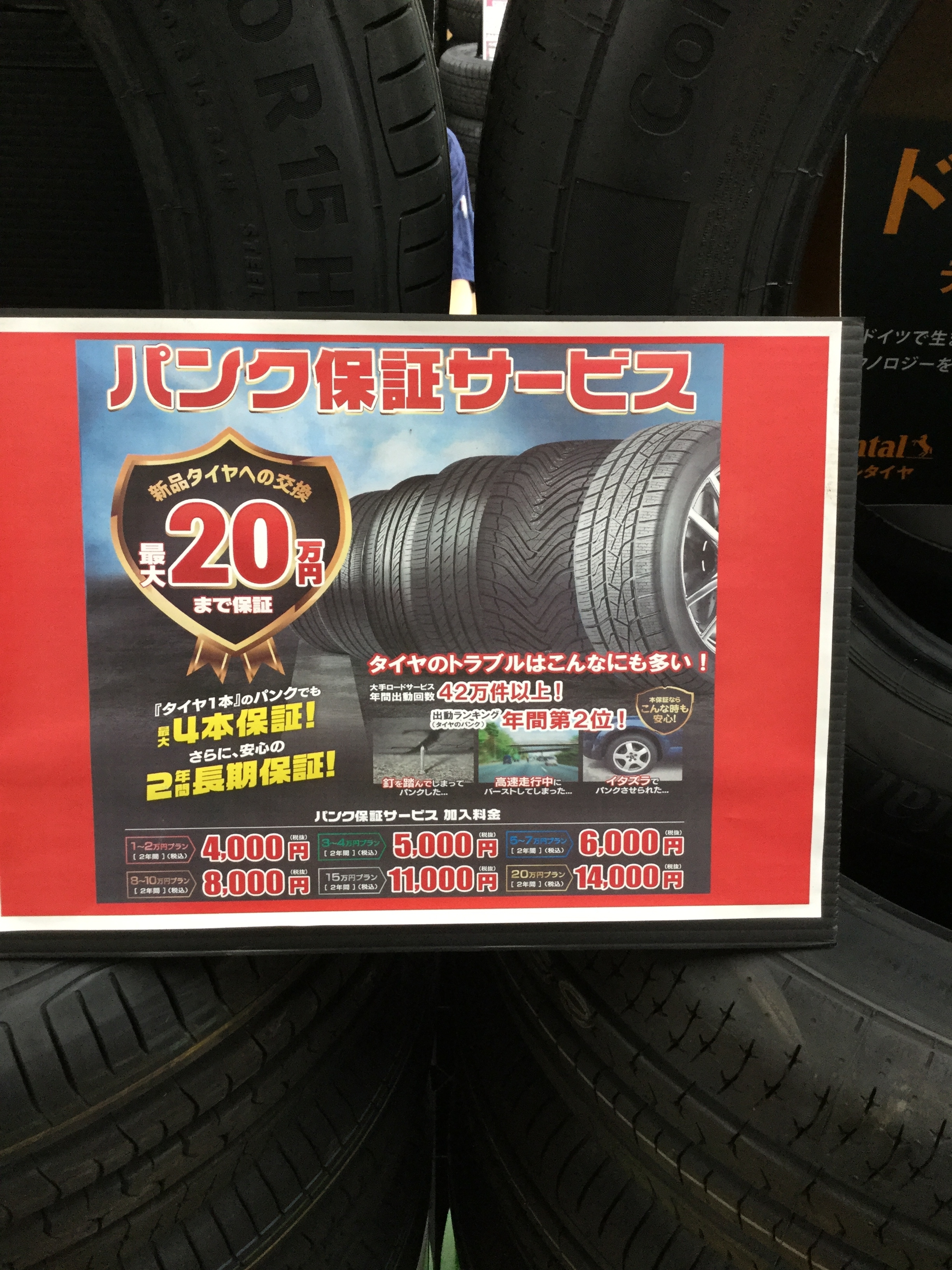 こんにちは、バロータイヤ市場正木店です。今回は、タイヤ購入の際に入っておくと安心な「パンク保証」についてです。 パンク保証は入っていただきますと期間中1本でもタイヤがパンクしたら同等クラスのタイヤを「4本保証」する2年間の保険となります。IMG_5480[1].JPG