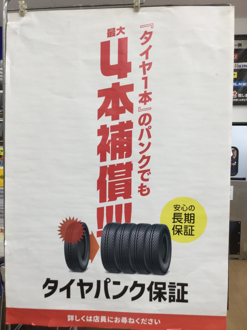 今回は、タイヤ購入の際に入っておくと安心な「パンク保証」についてです。 タイヤ購入時から2年間、パンクをしたら同等クラスのタイヤを「4本保証」する保険です。 「2年間だけだともったいない!」 と思われるかもしれませんが、例えば「4万円プラン」で加入金額5000円の場合 5000円÷24か月=約208円 1か月208円でもしものパンクの時にタイヤが保証されるのでとてもお得です!!IMG_5644[1].JPG