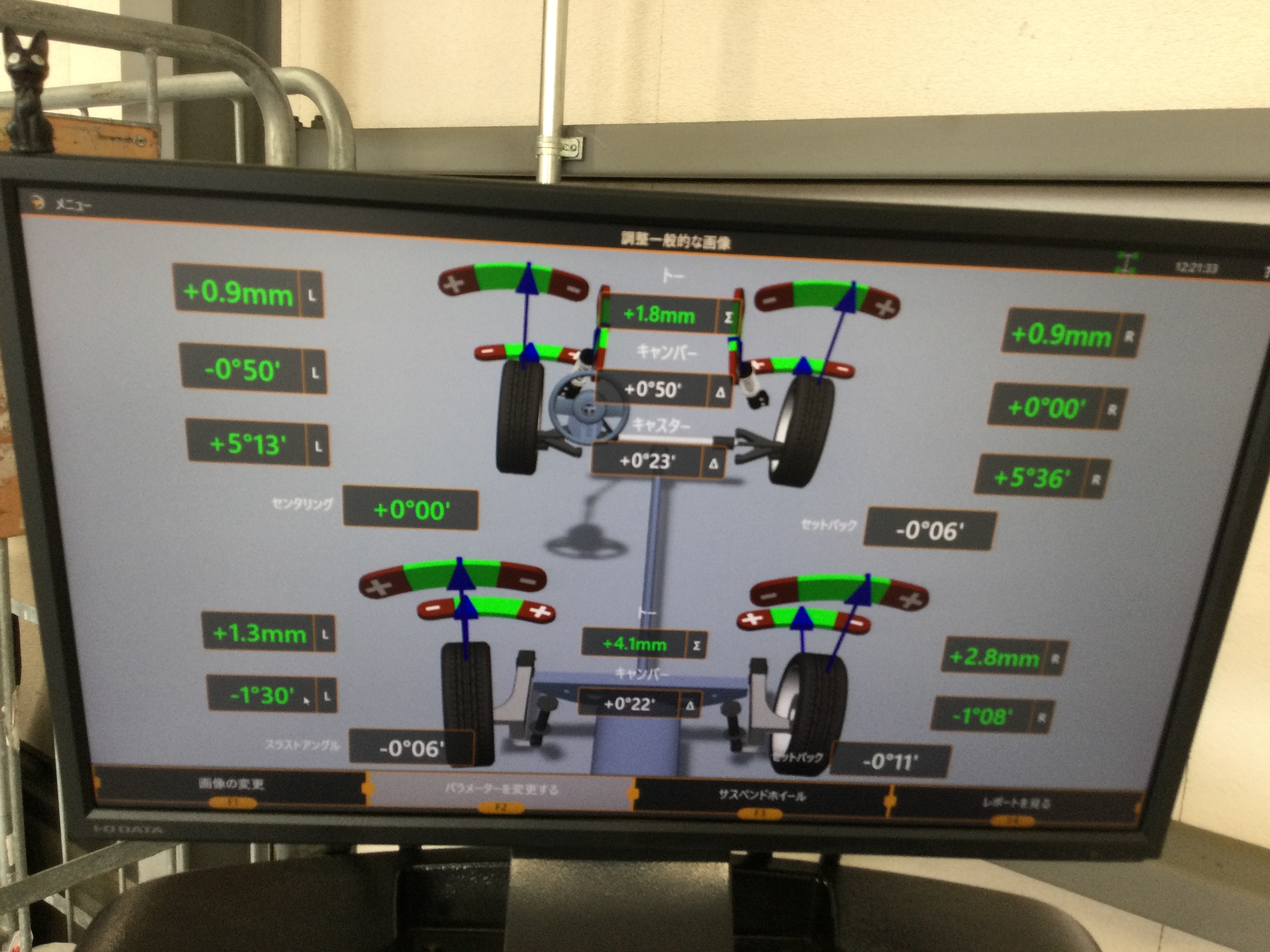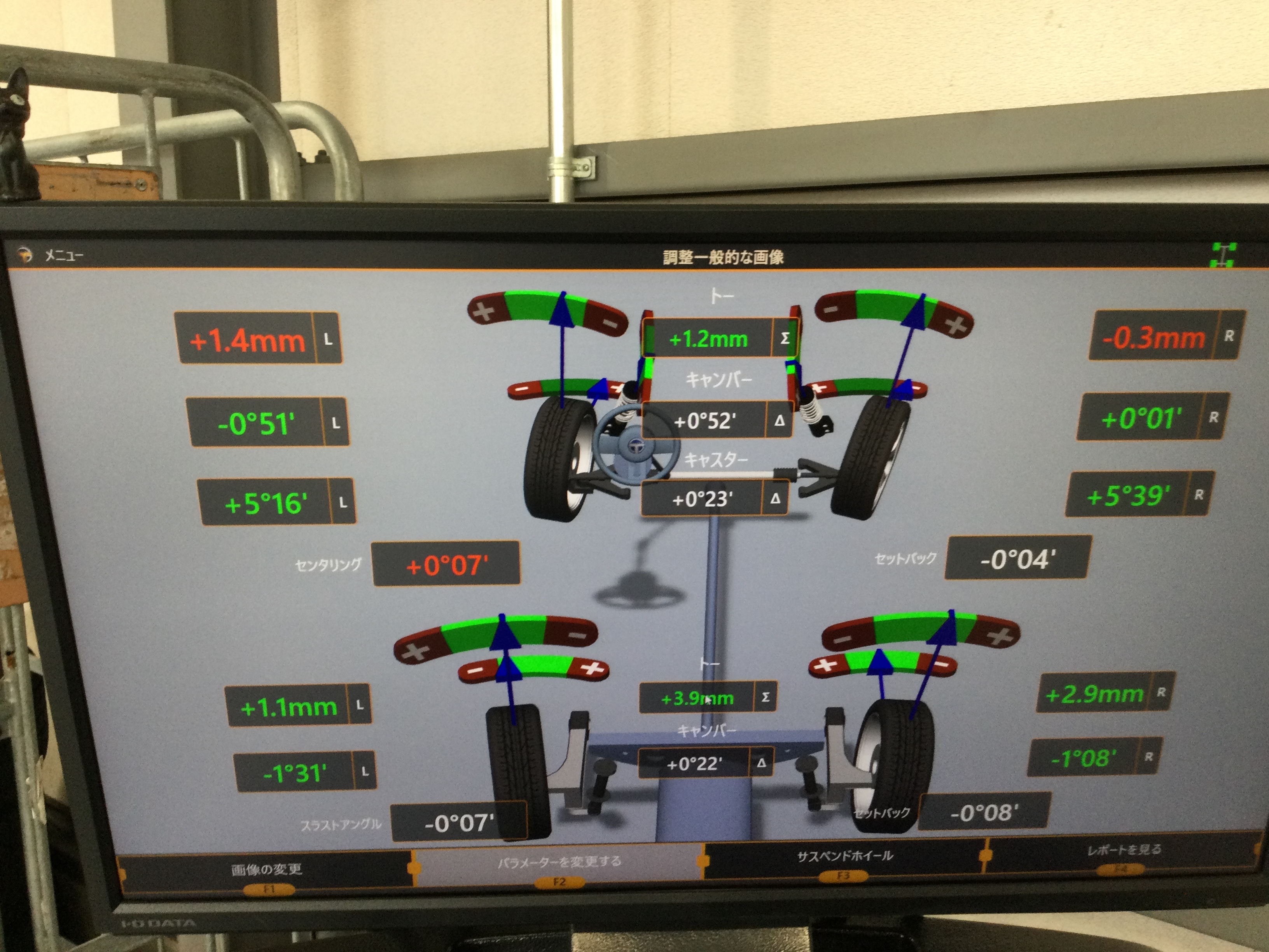 結果は、フロントのトー角はハンドルセンターのズレがあり少し右を向いている状態で、特に右前が大きく乱れていました(´;ω;`)