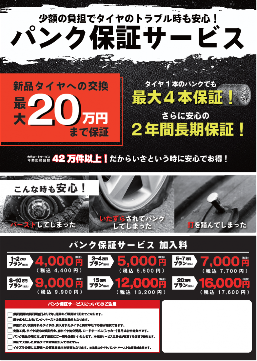タイヤが1本でもパンクした際に、同等グレードのタイヤを1本だけでなく4本全部新しいタイヤに交換できるため、