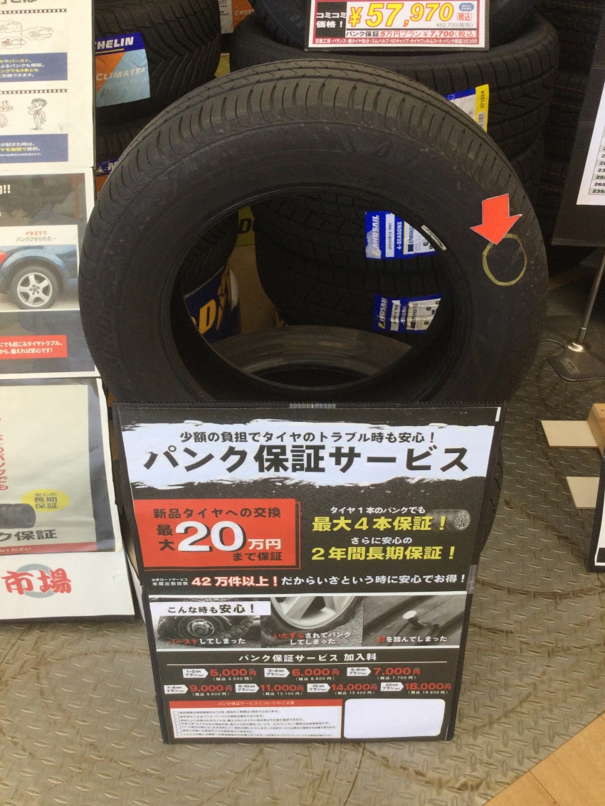 当店では、タイヤご購入の際にパンク保証に加入することが出来、パンクした際のタイヤの金額を4本すべて保証させていただきます。