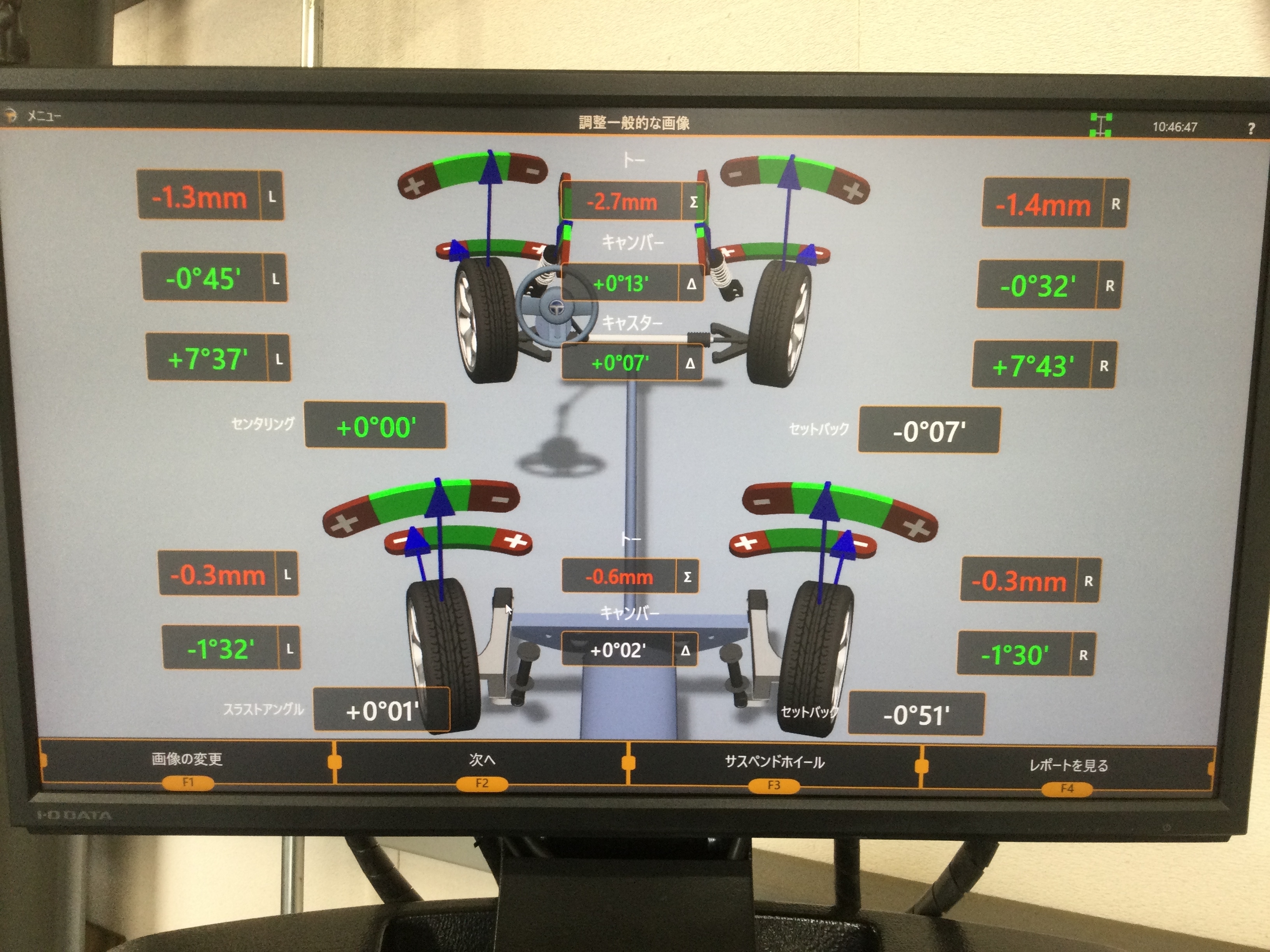 IMG_0799[1].JPG測定の結果、前後両方ともタイヤが外を向いていまして、どれも基準値から外れている状態でした。