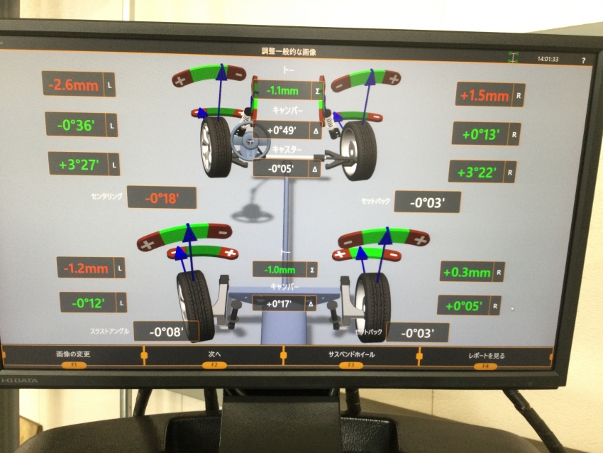 真っ直ぐに進むように、タイヤのズレを基準値まで戻させて頂きました。