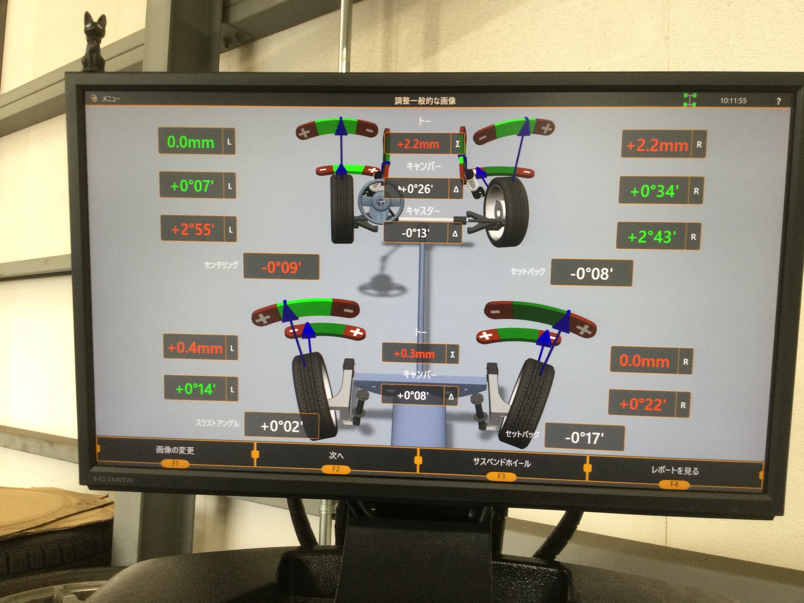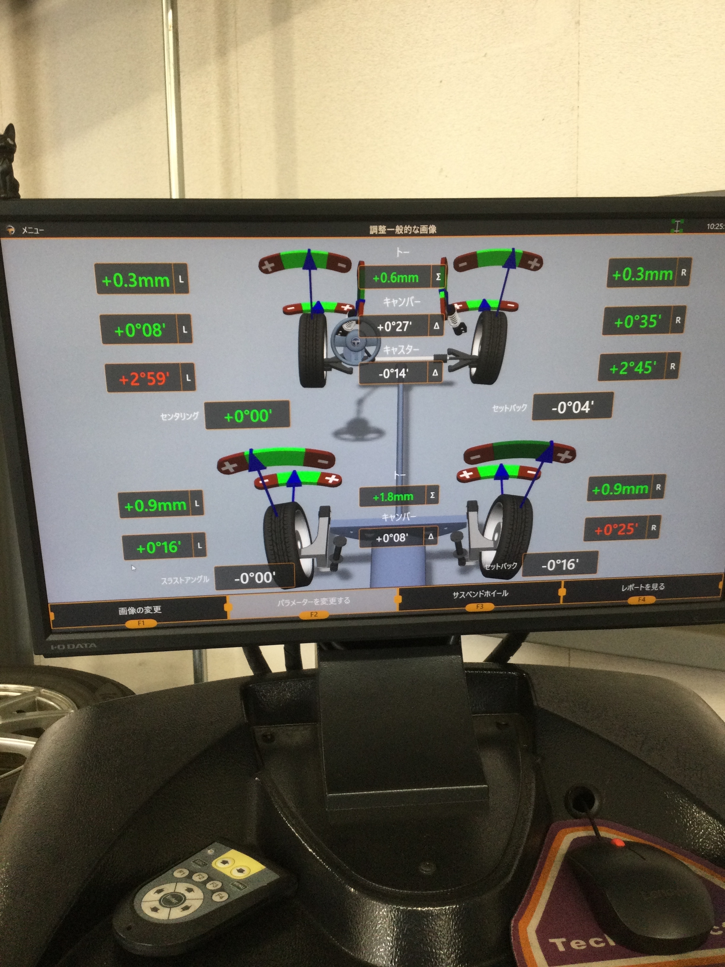 このように、お車の基準値で数値を合わせることが出来たため、片べりやハンドルのズレといった問題は解決できたと思います。