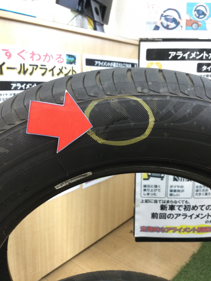 ②異物が、タイヤの端っこに刺さっている③傷が大きすぎたり、傷の近くに複数個の穴が開いている