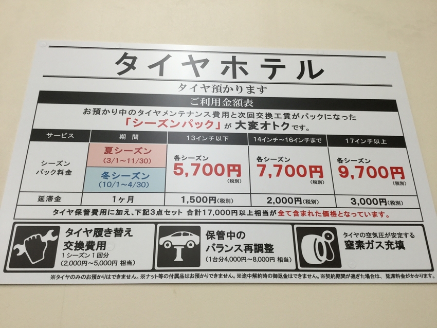 そんなタイヤホテルも、サイズによって料金が異なりますが、預けていただいたお客様には、バランス調整料が、入っている他、履き替えの際に、かかってきます、履き替え工賃も入っており、大変お得になっております!!