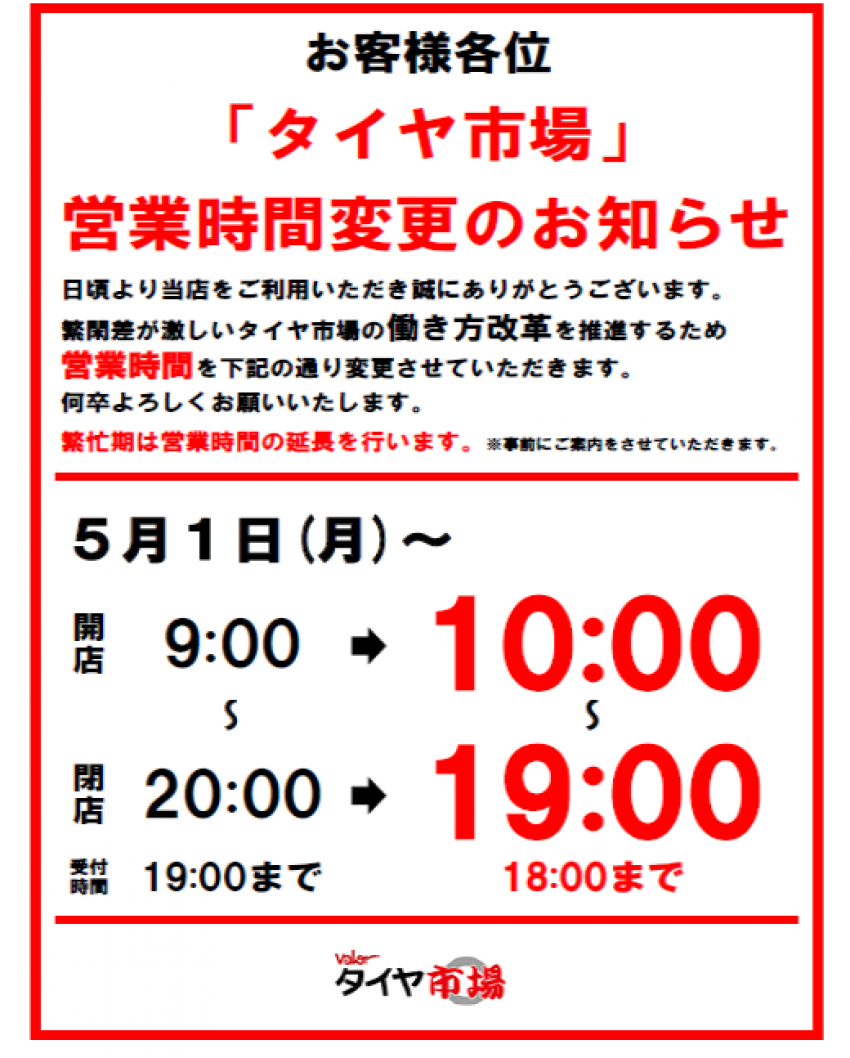 AM9:00~PM8:00(ピット作業受付:AM9:00~PM7:00)1月/2月/5月/6月/7月/8月/9月