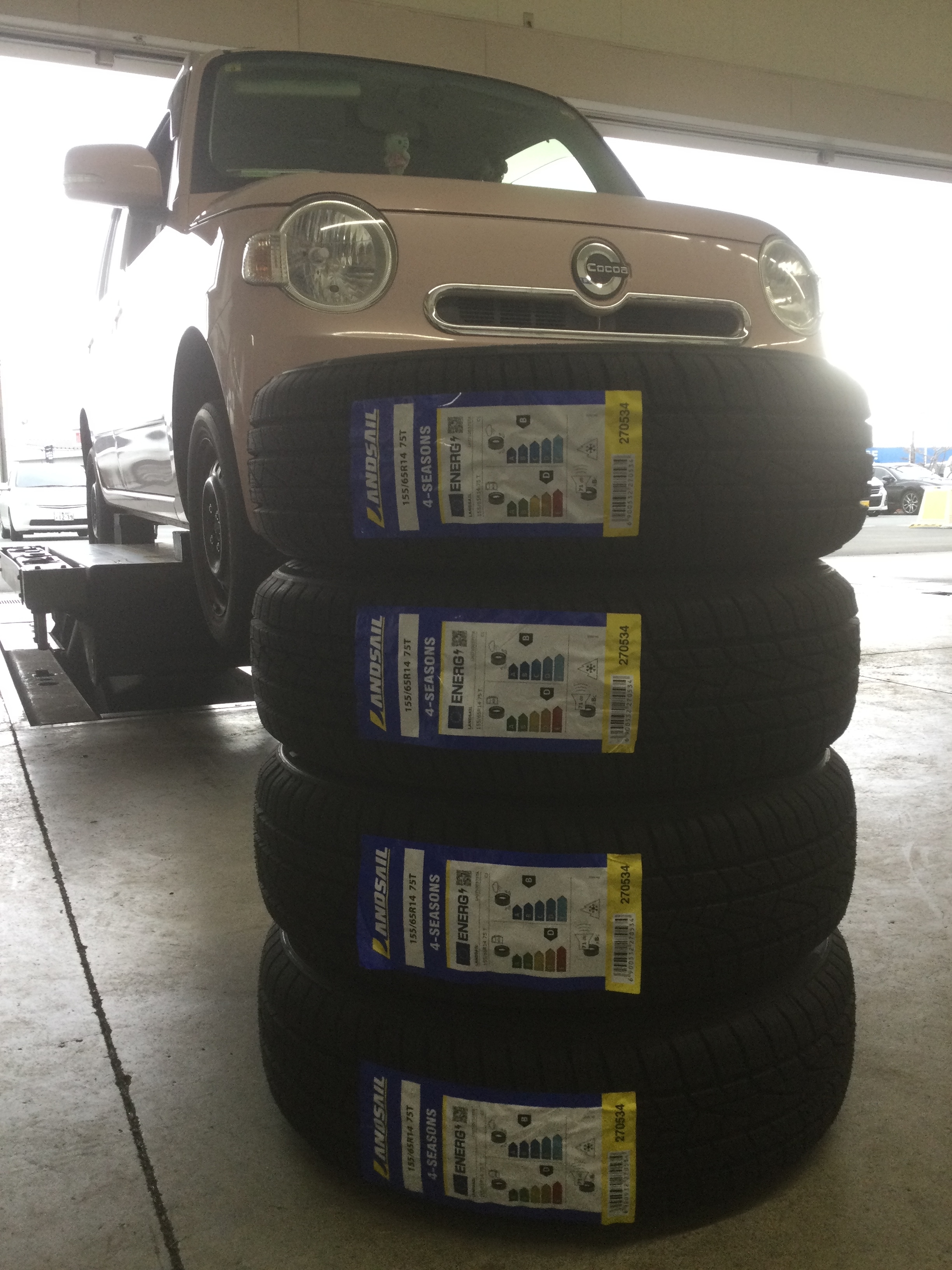 今回は、ミラココアにオールシーズンタイヤを装着致しました。