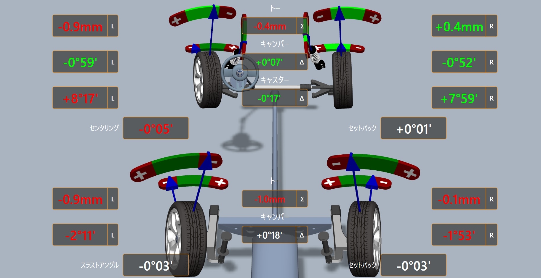 フロントトウ、リアトウ、リアキャンバーの6カ所調整です。