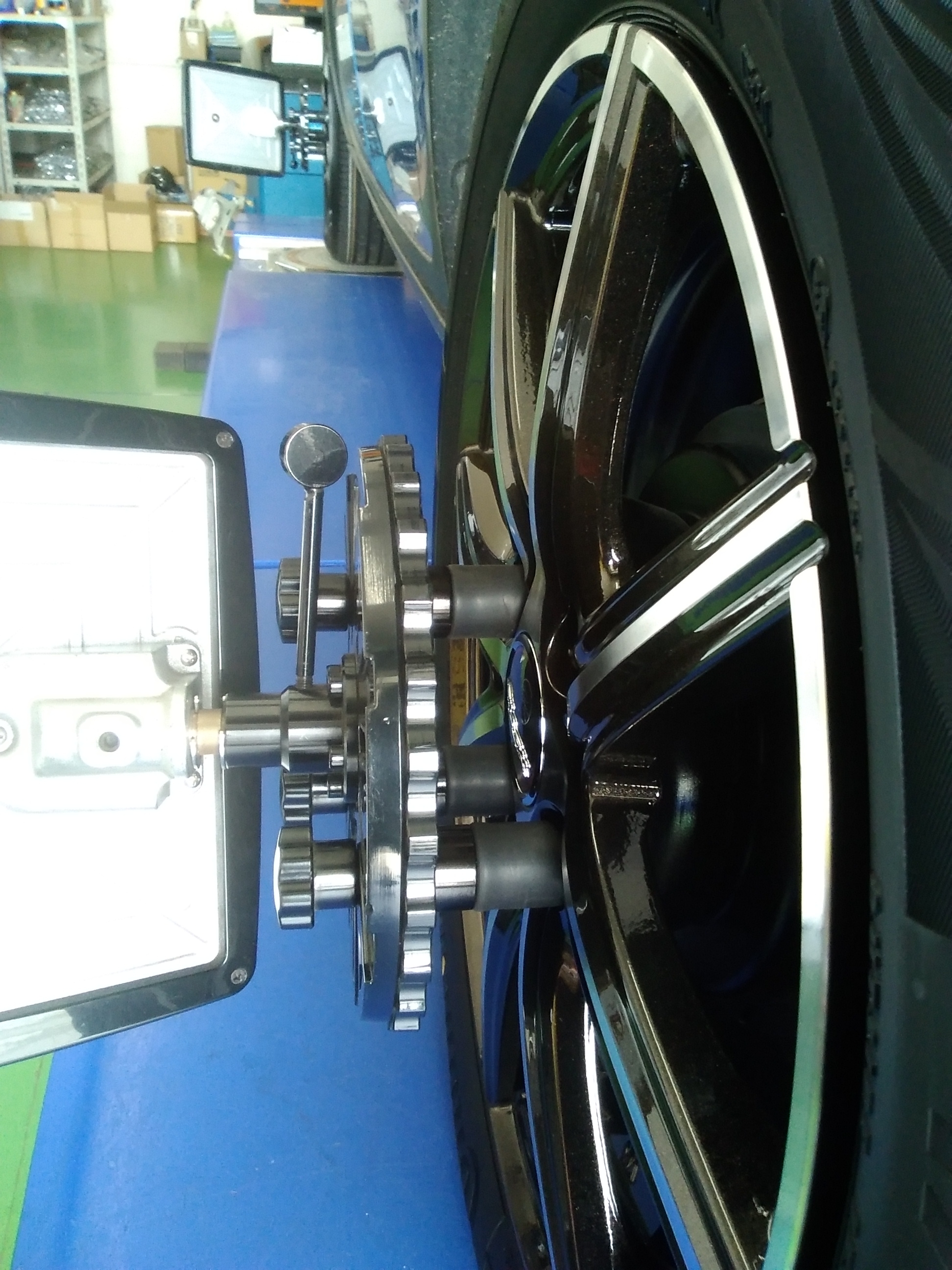 当店ではナット、ボルトの頭に強力なマグネットを使い測定器を固定する治具があるので新品ホイールでも傷の心配なくアライメント調整が行えます。