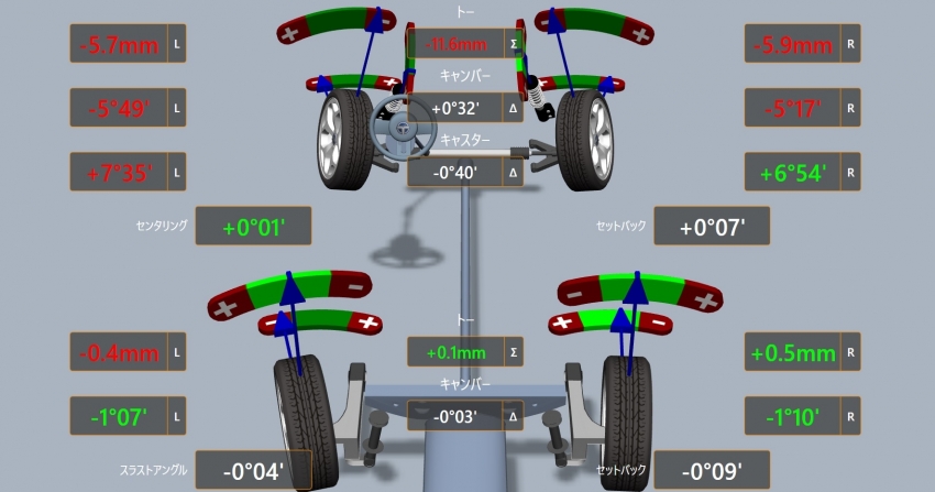 普段我々がアライメントをおすすめする際は真直ぐ走るかどうか?や変摩耗していないか?という部分が判断の基準になりますが