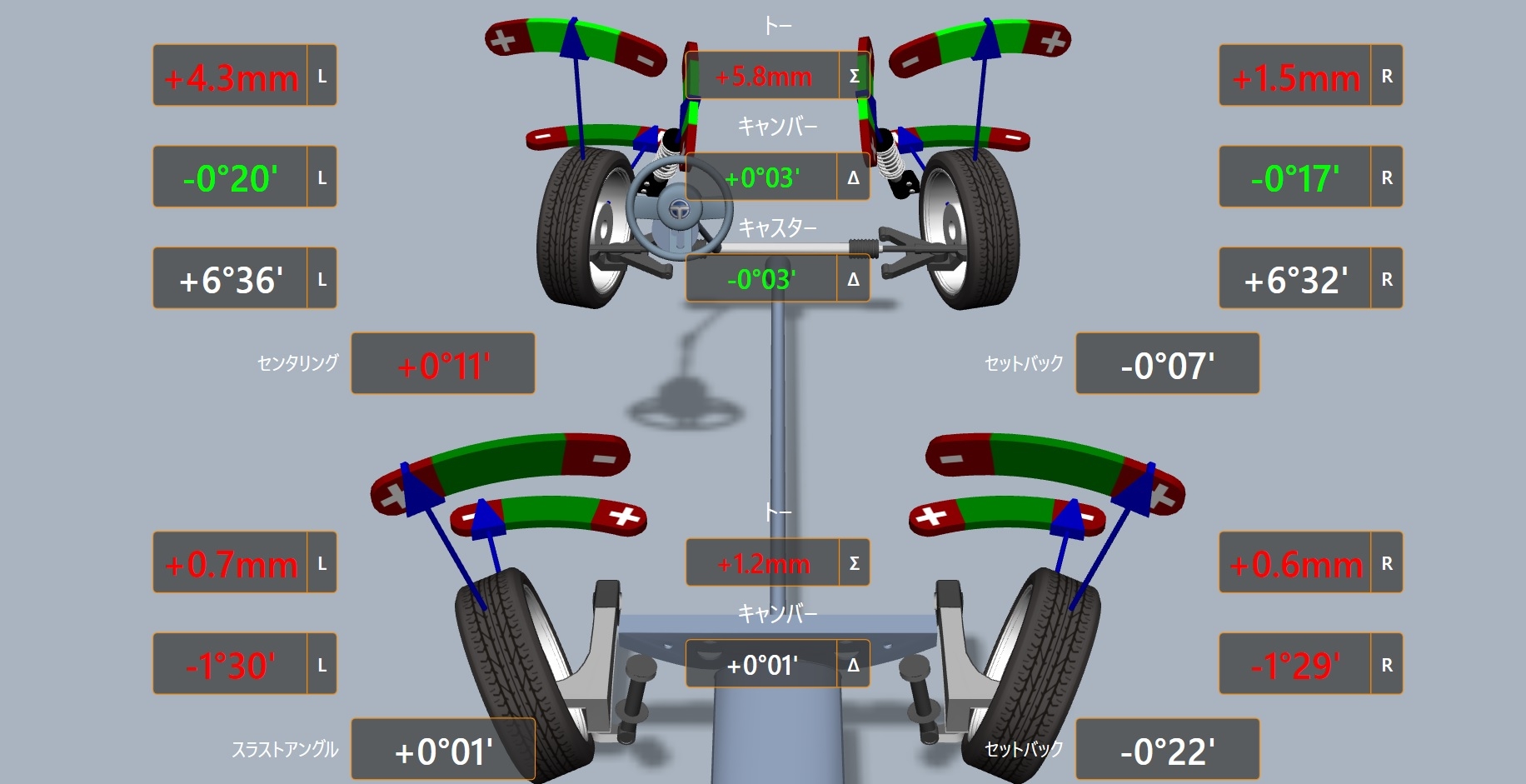 120iはフロントトーリアトーキャンバー計6カ所を調整していきます。