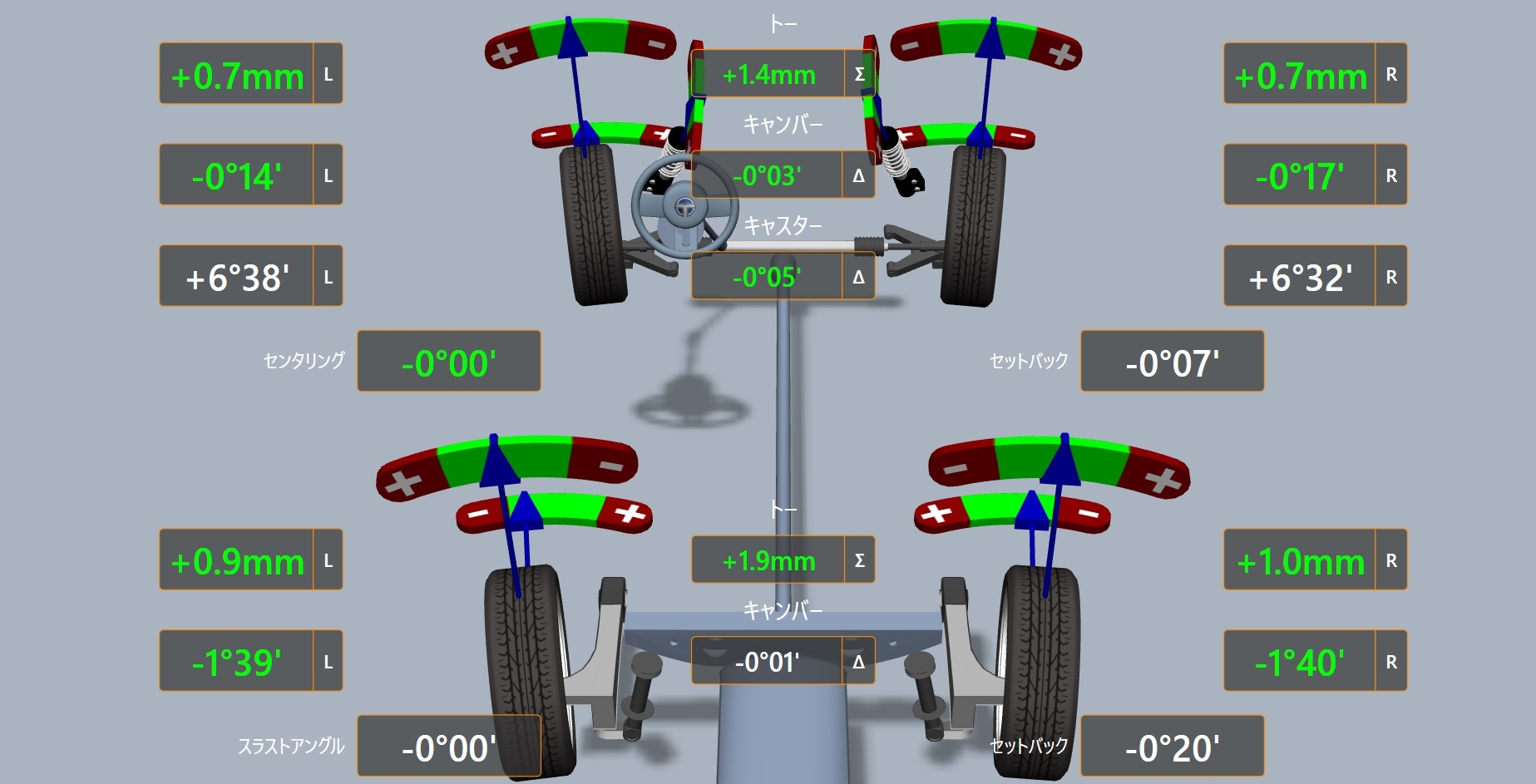リアは元々揃っていましたがBMW基準値範囲狭く細かいので微調整しました。