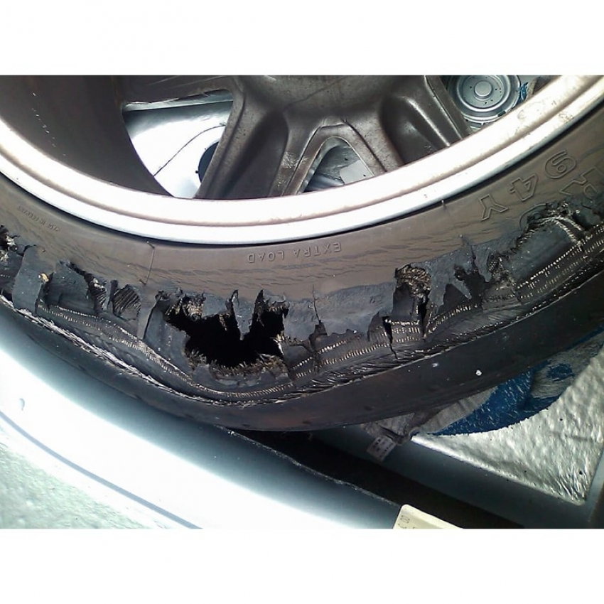 この状態で走ってくるのは本当に危険なのでスペアタイヤに交換するか、