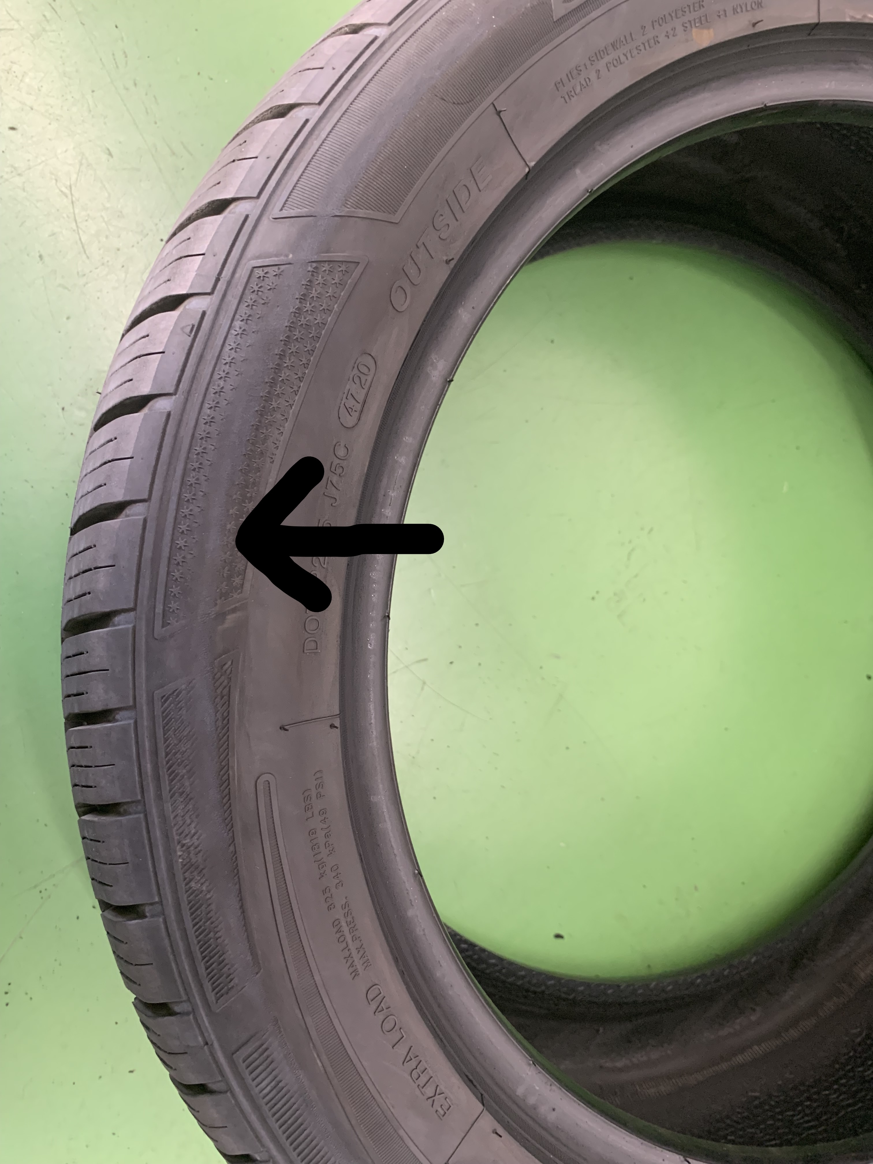 一見普通に見えますが、矢印の先の部分よく見るとタイヤが削れて線になってるの