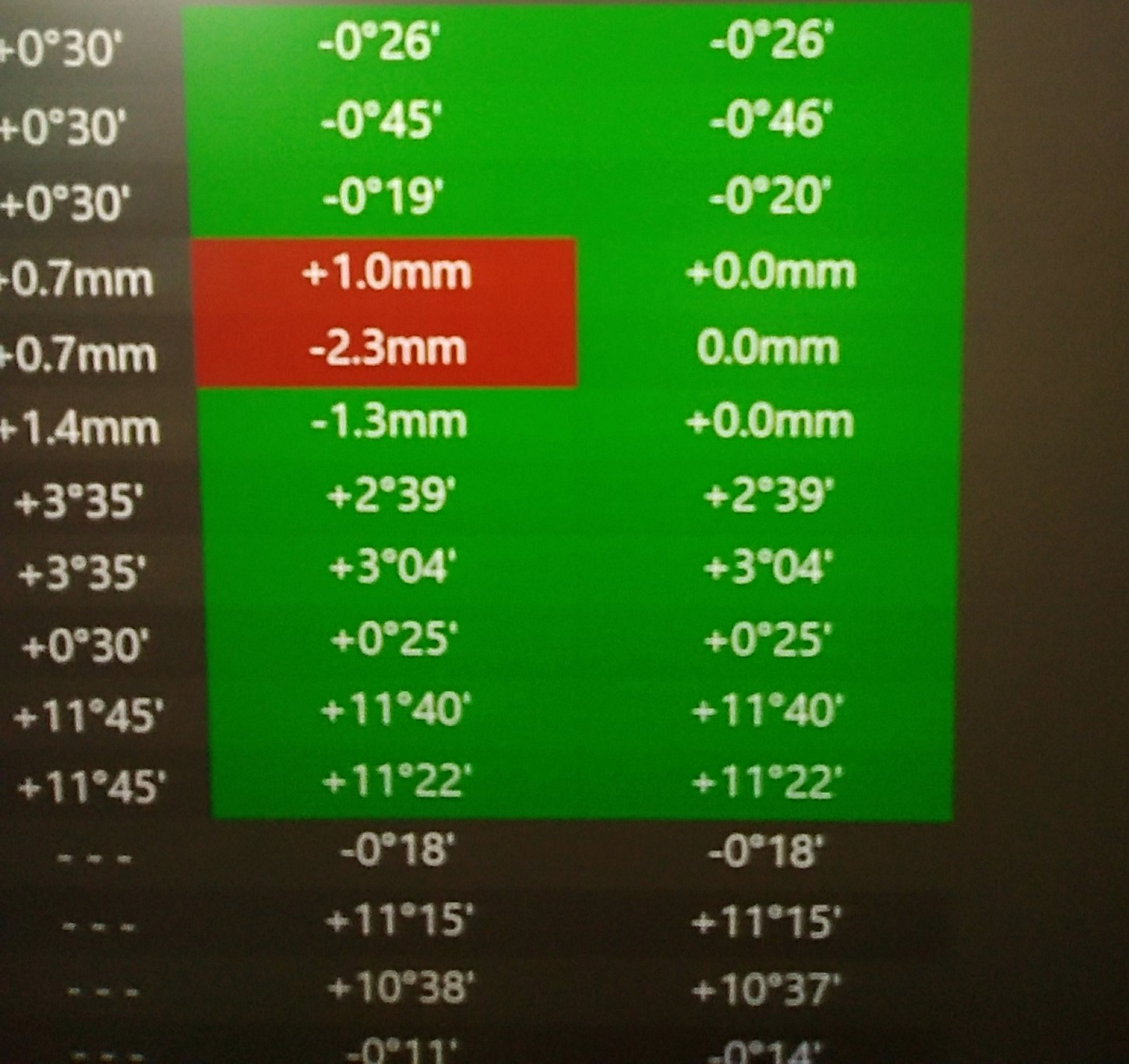 今回はタイヤの摩耗状態が内べり(トーアウト)にズレていたのでしっかり基準値に合わせました!!赤い部分が調整前と隣の数字が調整後になります。