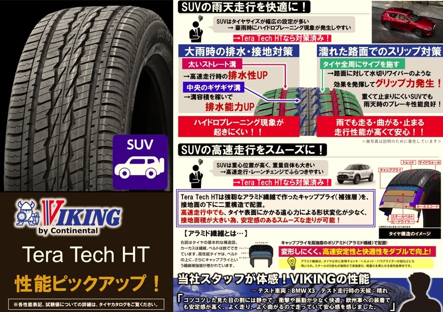 バイキングのタイヤは高いウェット性能と走行安定性を兼ね備えていますので背の高いミニバンやSUVに最適なタイヤとなっております( ..)φメモメモ