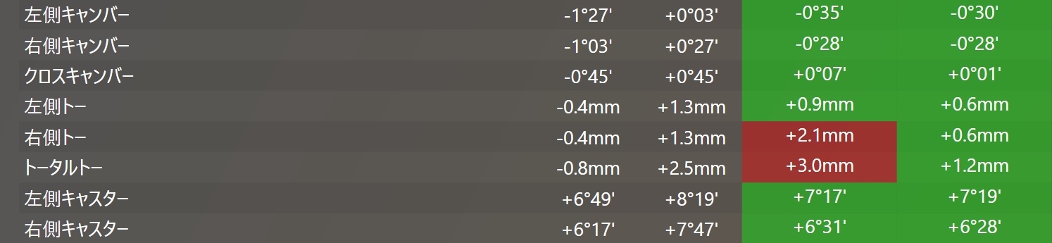 この車はキャンバー、キャスターの基準値に左右差が設けられており、左通行の道路で左流れ防止の数値が設定されています。