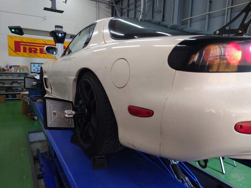 RX-7もフロントトー、キャンバー、キャスター、リアトー、キャンバーの左右計10カ所を調整していきます。