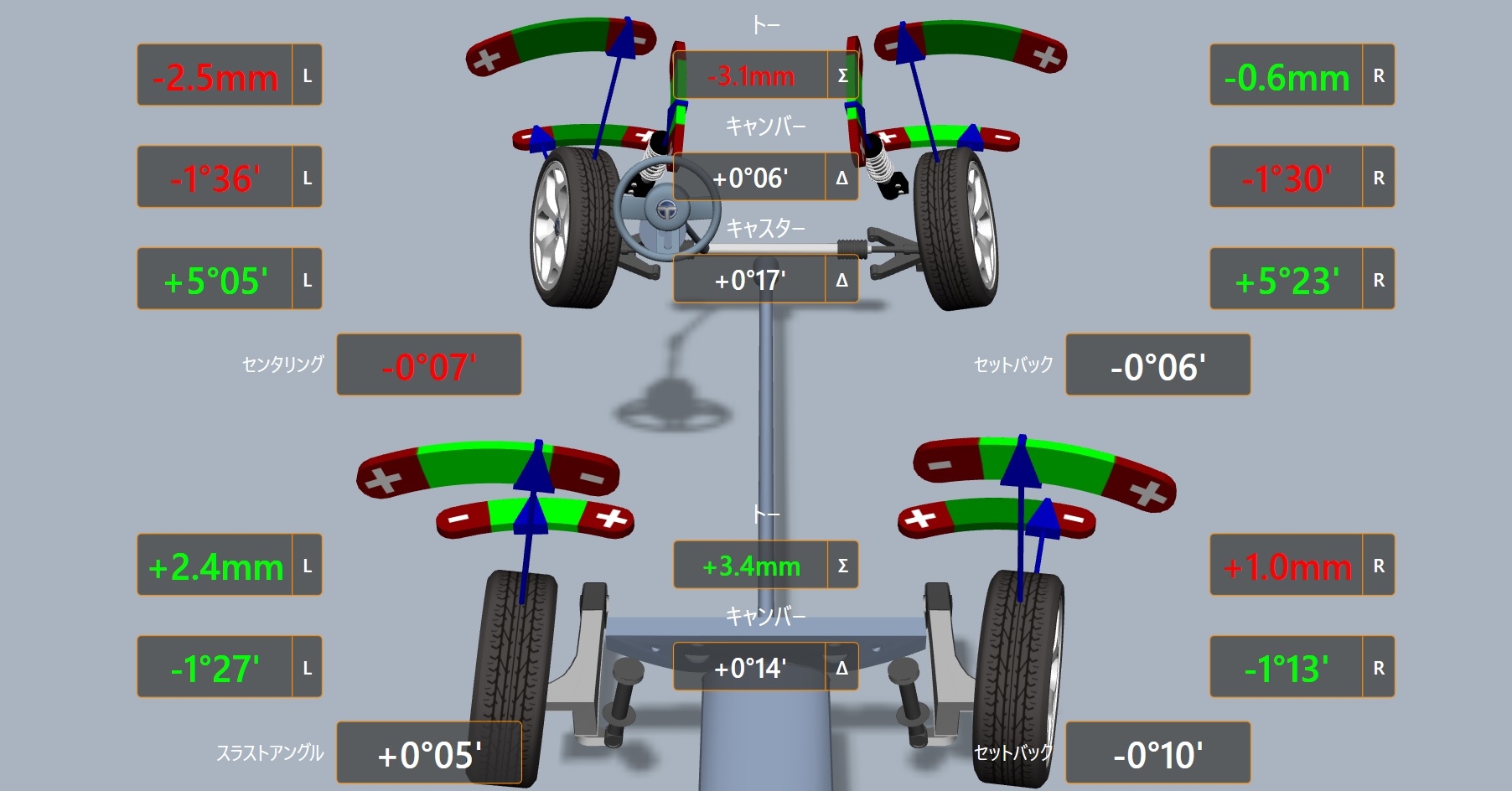 キャンバーは揃っていますが前後トーのズレによってハンドルセンターもズレが発生しています。