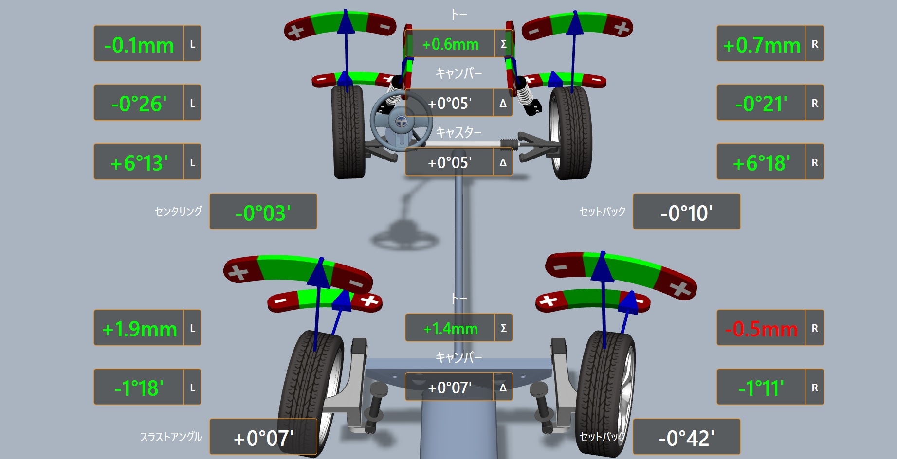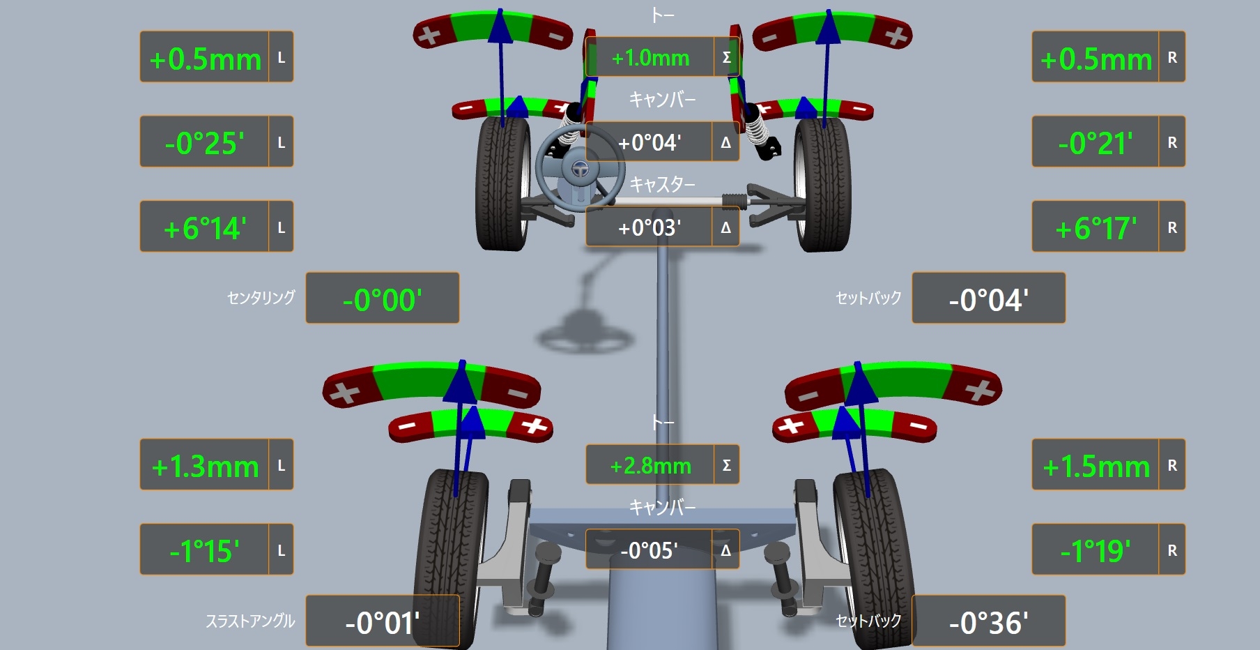 トータルトーは基準値内ですが個別に見ると左右差があるのでハンドルセンターに影響していますね。