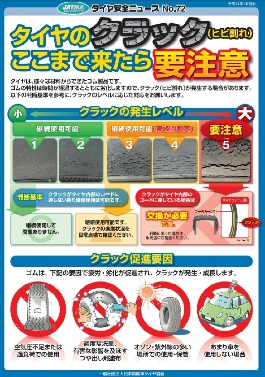ひび割れの原因で多いのが、空気圧不足、過荷重、劣化などなどです。