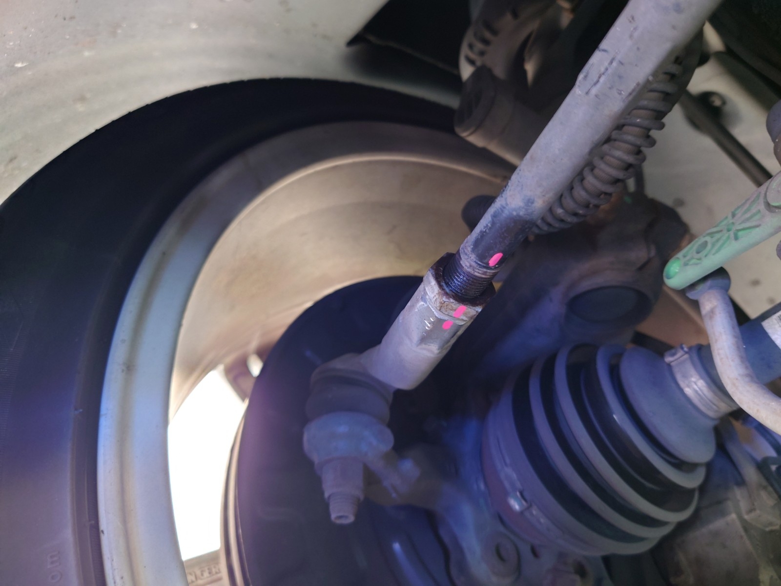 切れ角やタイロッドの長さが左右でおかしくなるので必ずタイロッドの調整で合わせます。
