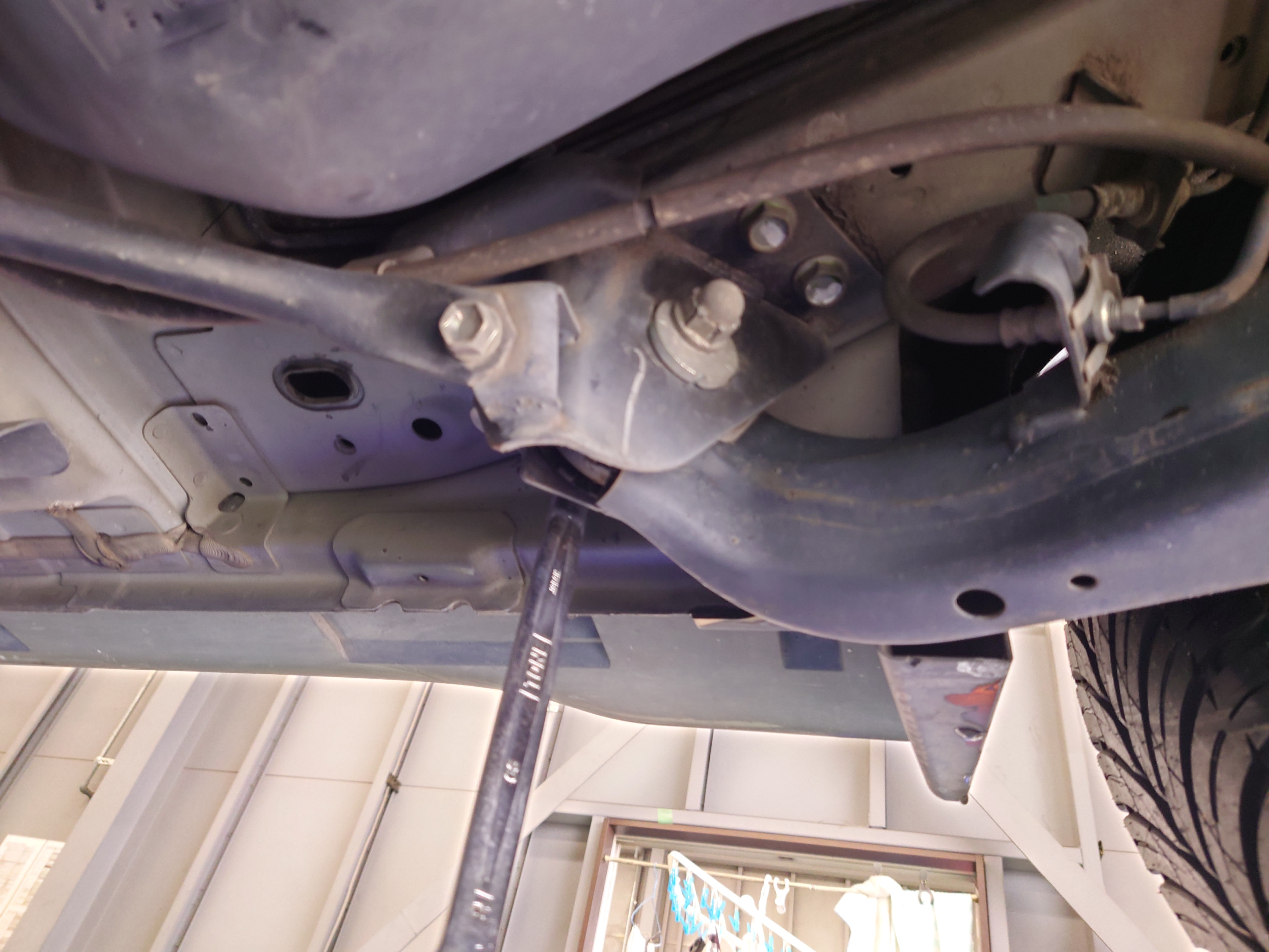 場所的にリフトと工具が干渉するのでタイヤ交換中に緩めておきました(^^♪