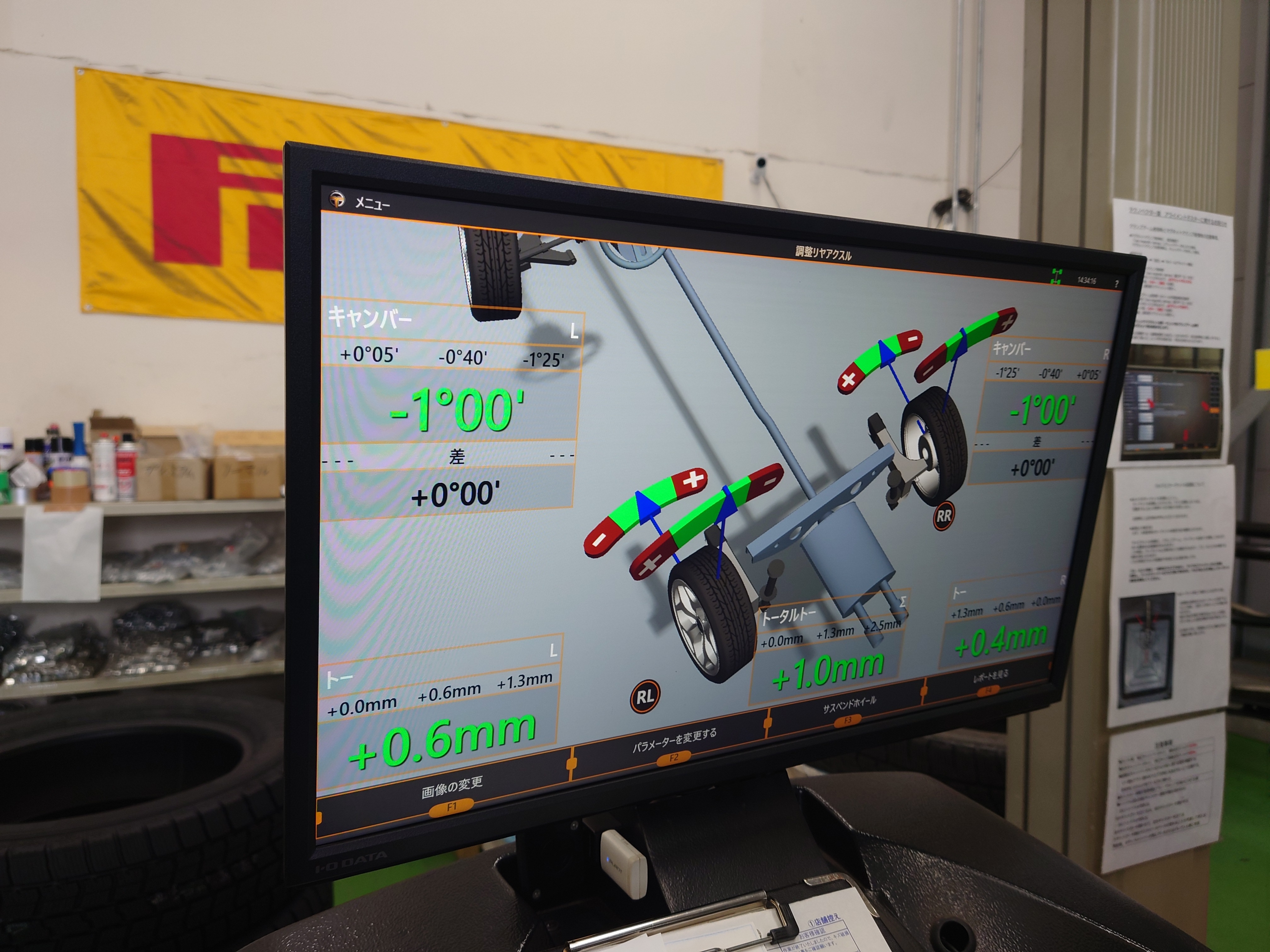 フロントトー、リアキャンバー、トーの計6カ所を調整していきます。