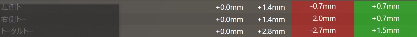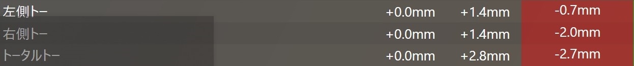 トーの基準値が0ミリから+1.4ミリに対して左側が-0.7ミリ、右側が-2.0ミリでした。