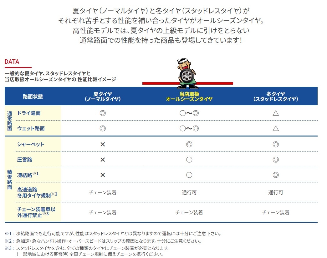 茨城県の水戸など雪が降るか降らないかわからないような地域では急な付け替えがいらなくなるのでオススメです