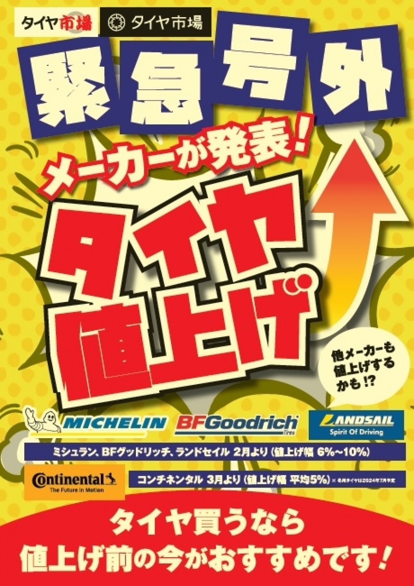 2月からミシュラン、BFグッドリッチ、ランドセイルが6%~10%