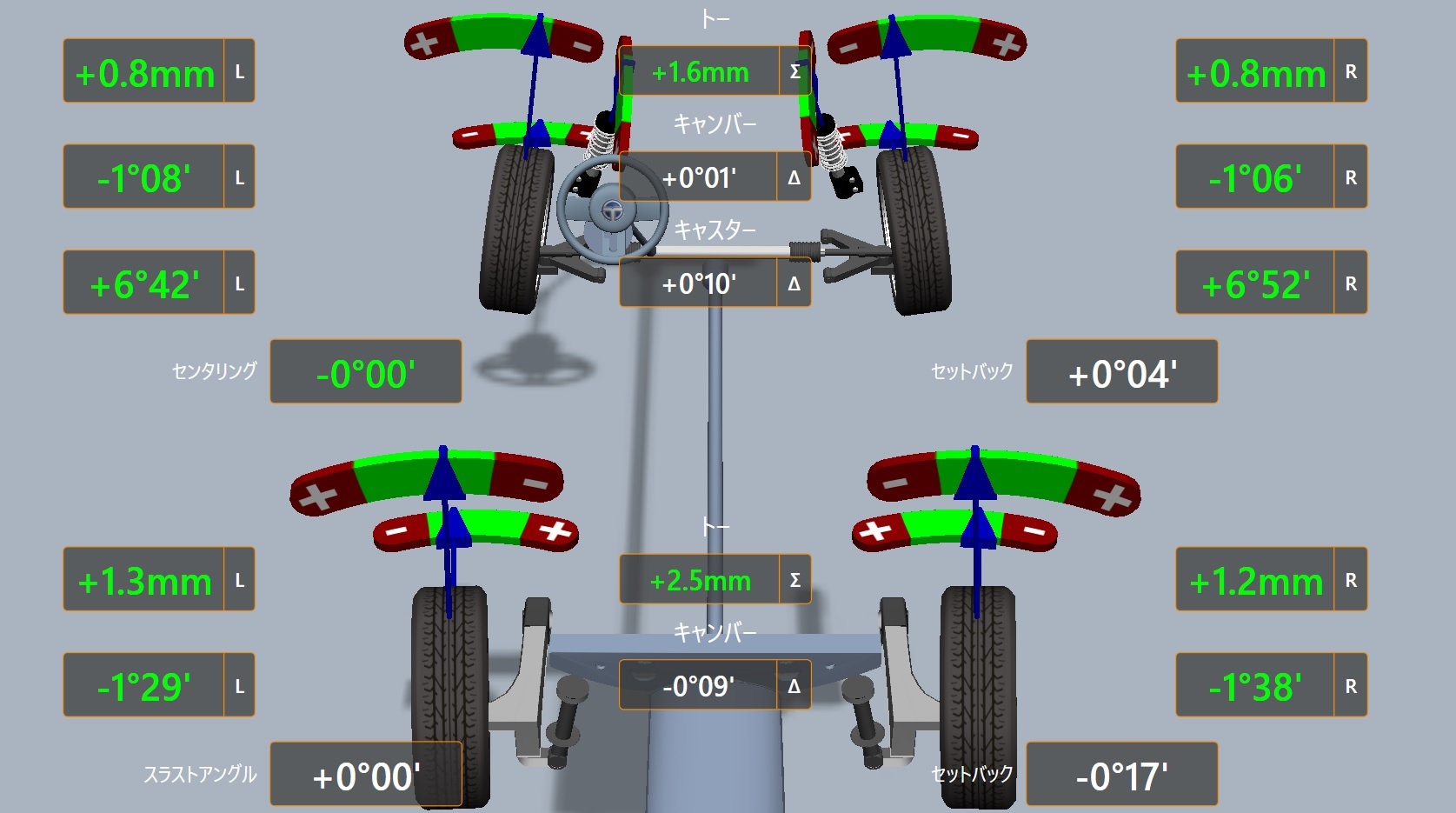 調整出来ないキャンバー、キャスターの左右差も無くハンドルセンターもバッチリ戻りましたので本来の走りが出来ますね(^^♪