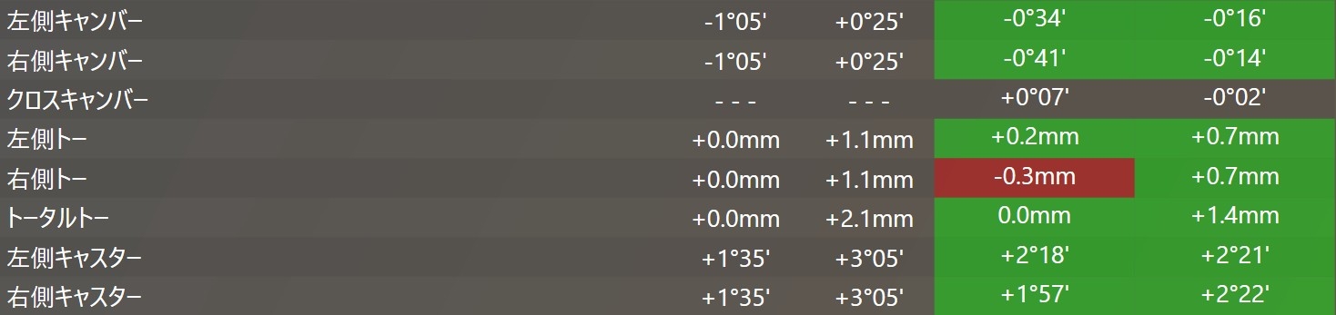 今回のお車は調整箇所がフロントのキャンバー、キャスター、トーになります。
