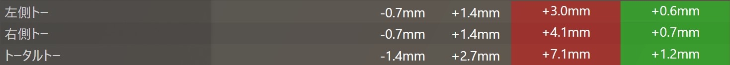 リア側のトーが左側が+3ミリ、右側が+4.1ミリとトーイン方向(内股方向)にズレが出ていました。