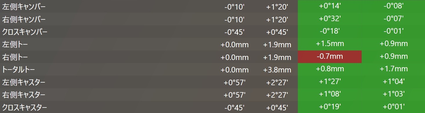 キャスターは左右差を整え、トーは左右でトーイン、トーアウトがちぐはぐでしたので基準値でそろえさせていただきました。