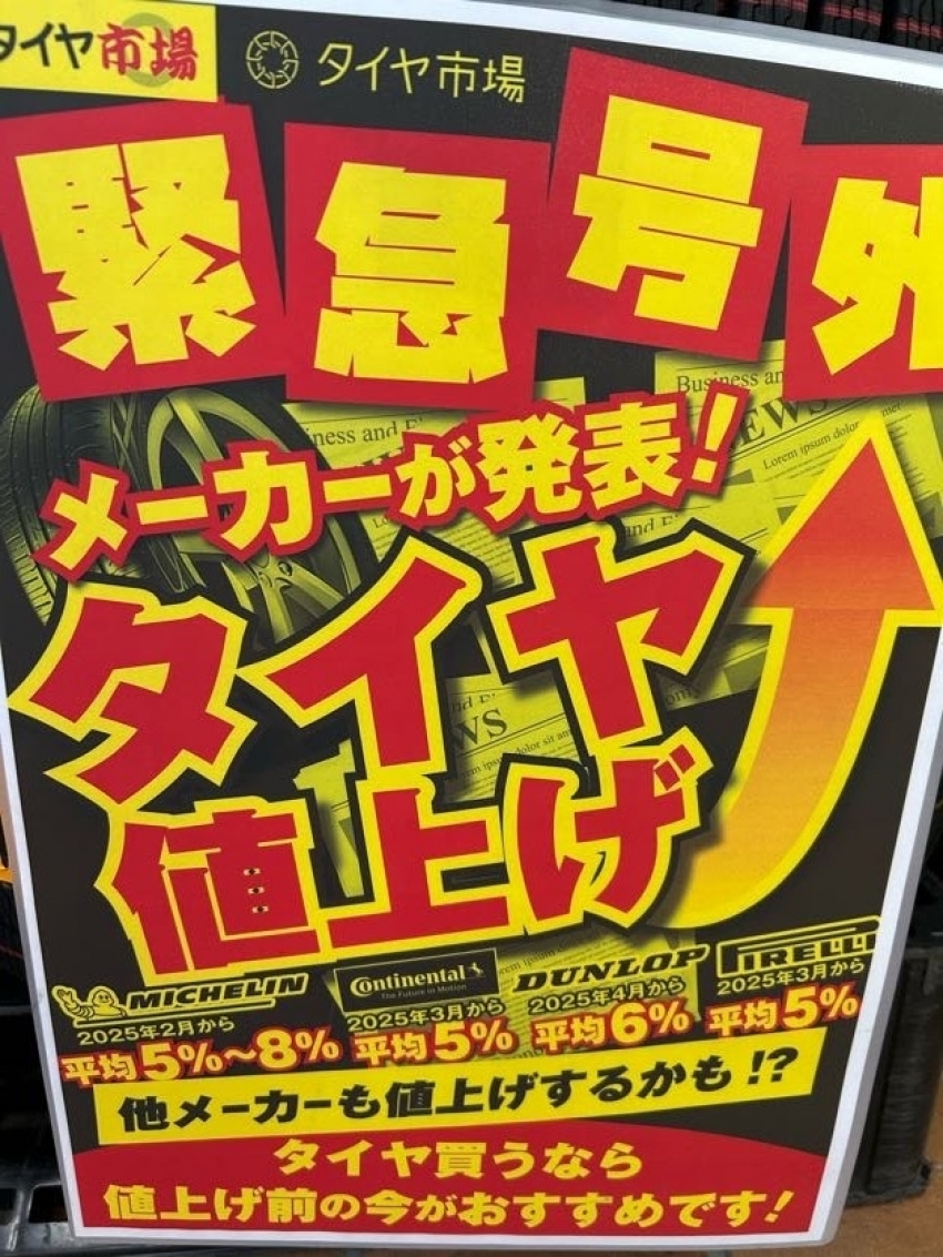 【タイヤ市場水戸笠原店】緊急号令!!!タイヤ値上げ↑↑↑