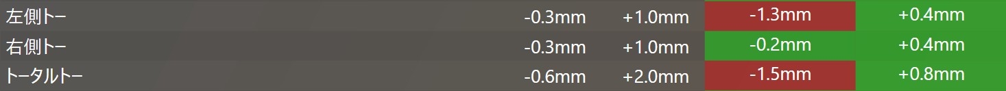 数値のズレとしてはフロント左側とリア右側のトーがアウト側にズレていました。