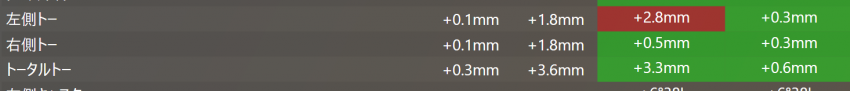 数値のズレとしてはフロント側のトーがイン側にずれていたのとリア側は左右でトーイン、トーアウトがちぐはぐになっていました。