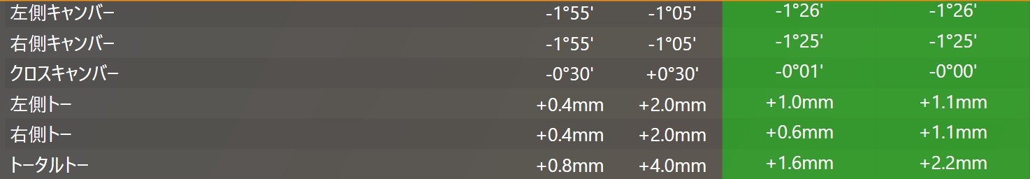 数値のズレとしてはフロント側のトーがイン側にずれていました。
